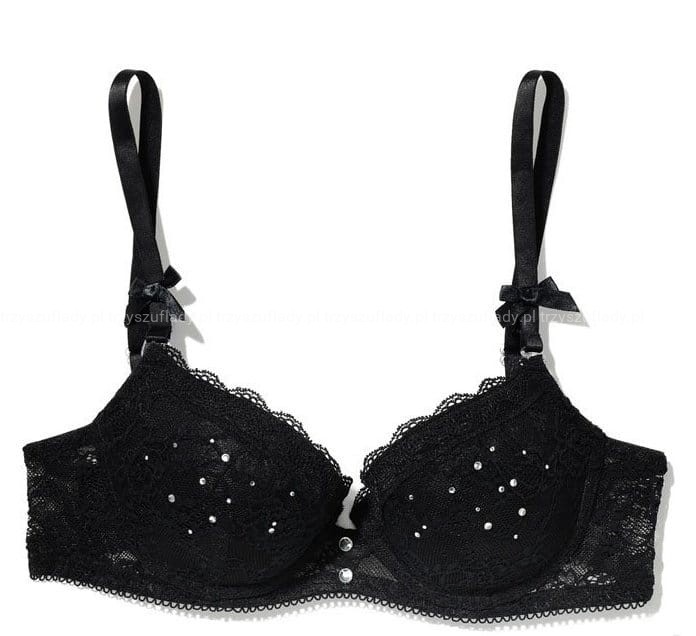 - Biustonosz posiada odpowiednio wyprofilowane miseczki, usztywniane laminatem, które podtrzymują biust i ładnie eksponują dekolt. Biustonosz jest obszyty delikatną koronką z małymi cekinami na miseczkach.