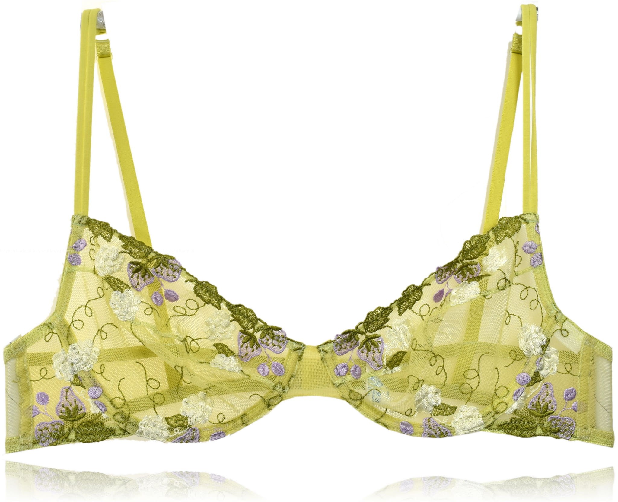 - miseczki w całości koronkowe - tiul haftowany, miękkie, transparentne pokryte uroczym wzorem - truskawki i kwiaty
