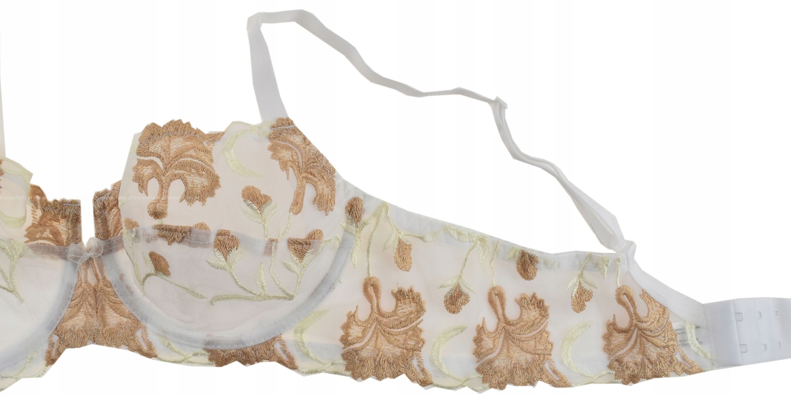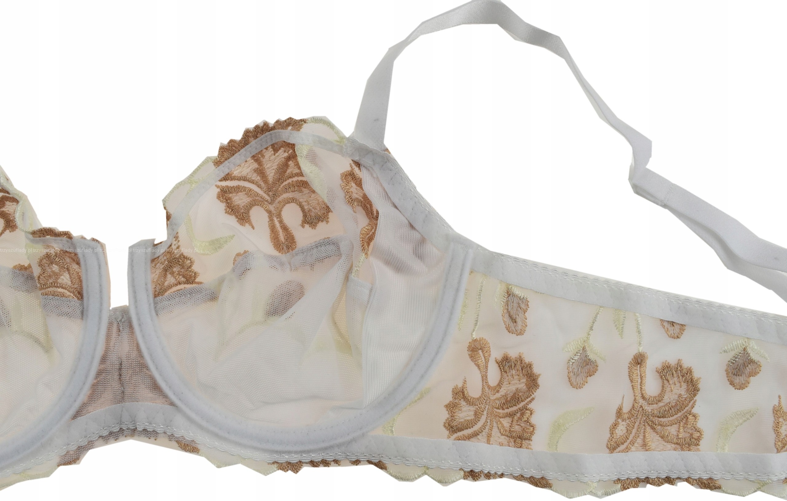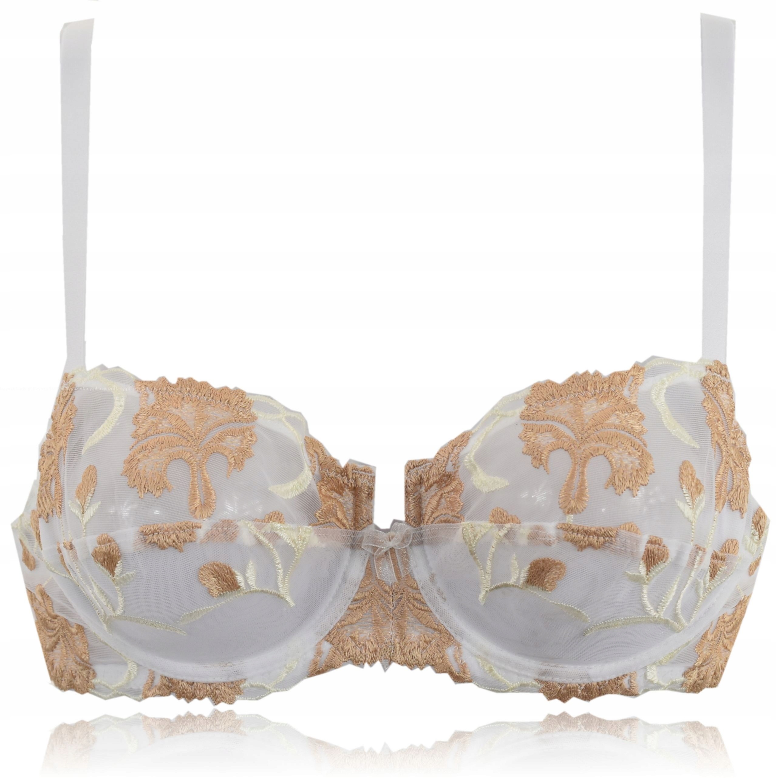 Motyw główny to bogata ornamentyka na transparentnym tiulu w kontrastowych kolorach beżu na białym tle, dodająca stanikowi wyrafinowania i elegancji, ale równocześnie delikatnego romantyzmu. Do kompletu dostępne majteczki w dwóch krojach - figi i stringi.