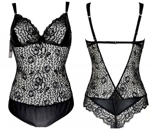 Body w całości wykonanye z elastycznej przeźroczystej koronki przeplatanej wstawkami z tkaniny a'la skóra - o matowej fakturze. Miseczki miękkie, bez wypełnień i usztywnień.