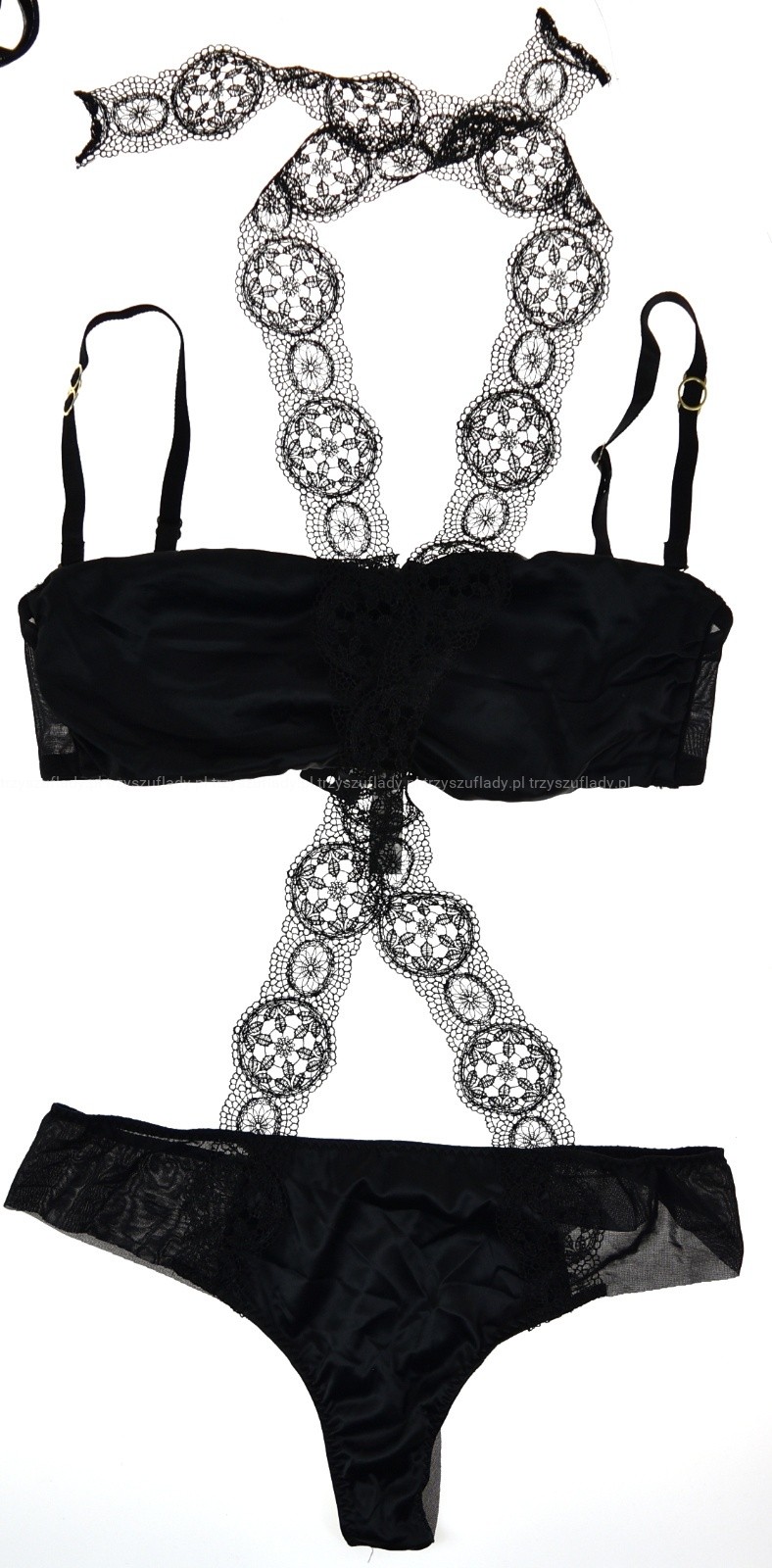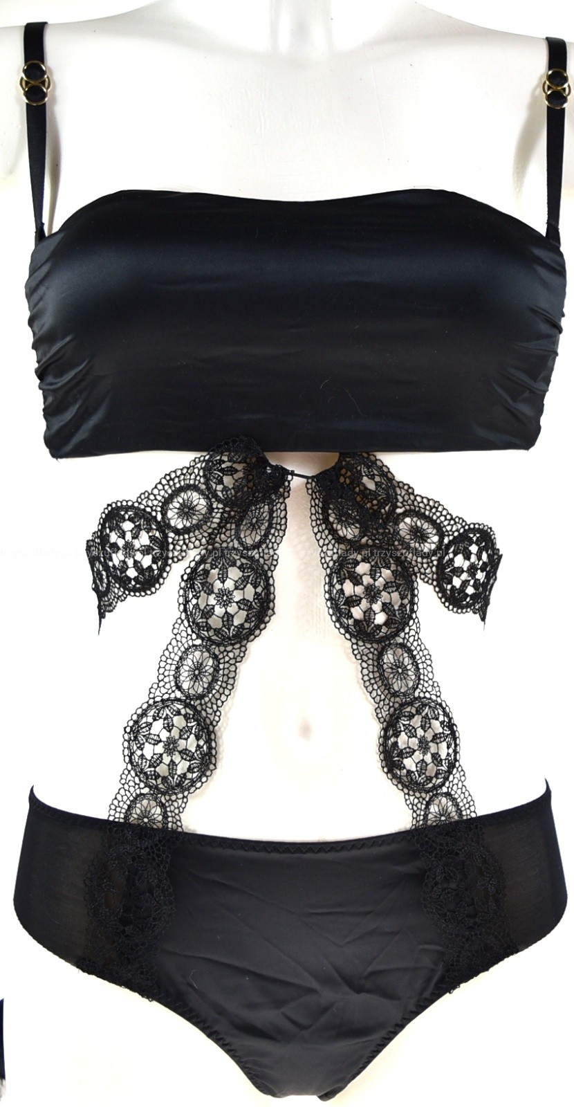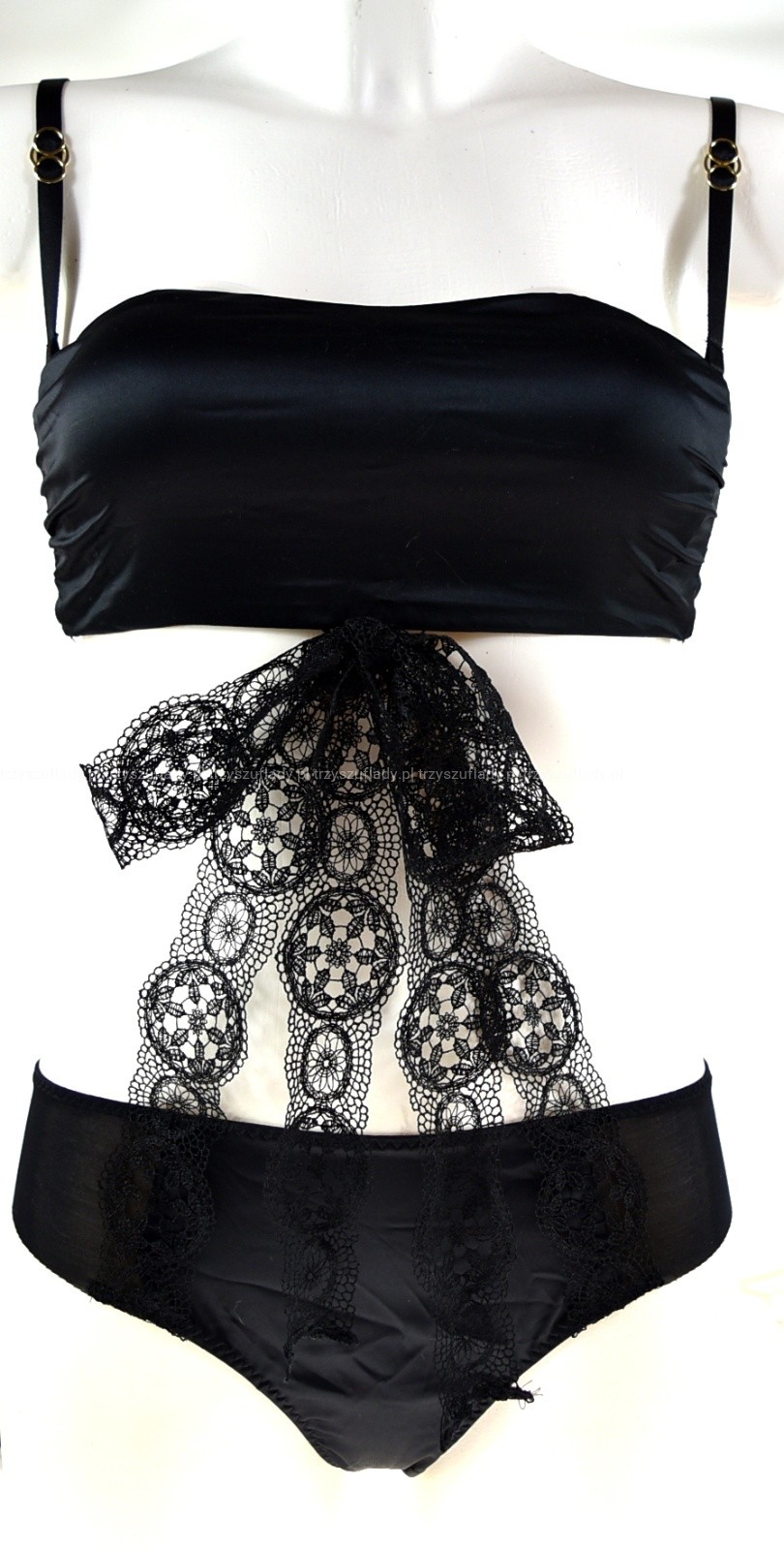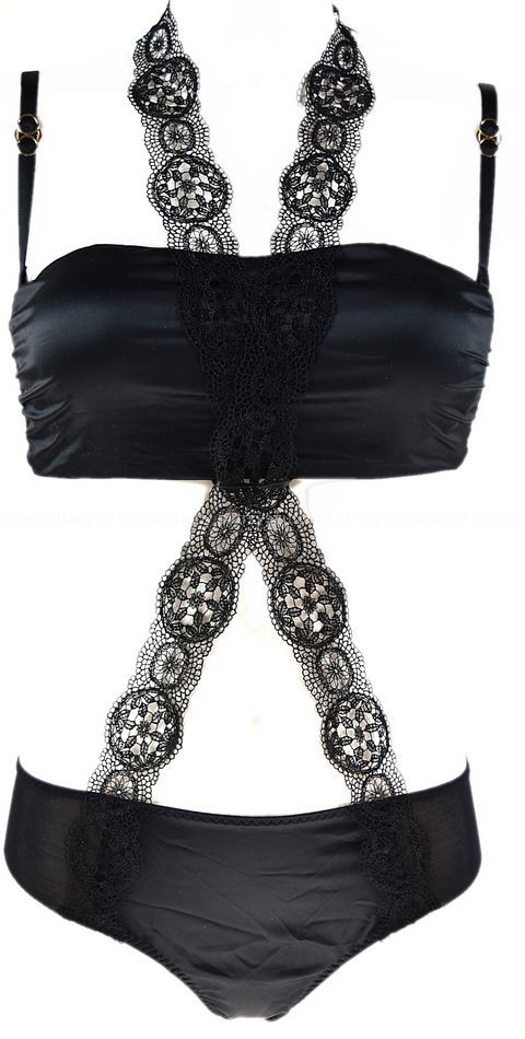 Body składające się z biustonosza - opaski oraz - majteczek - które, łączą szarfy z gipuiry, swoim niesztampowym krojem, stanowi prawdziwy rarytas dla oczu.