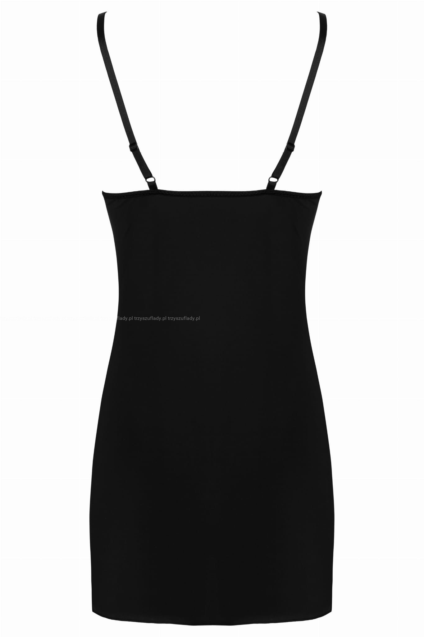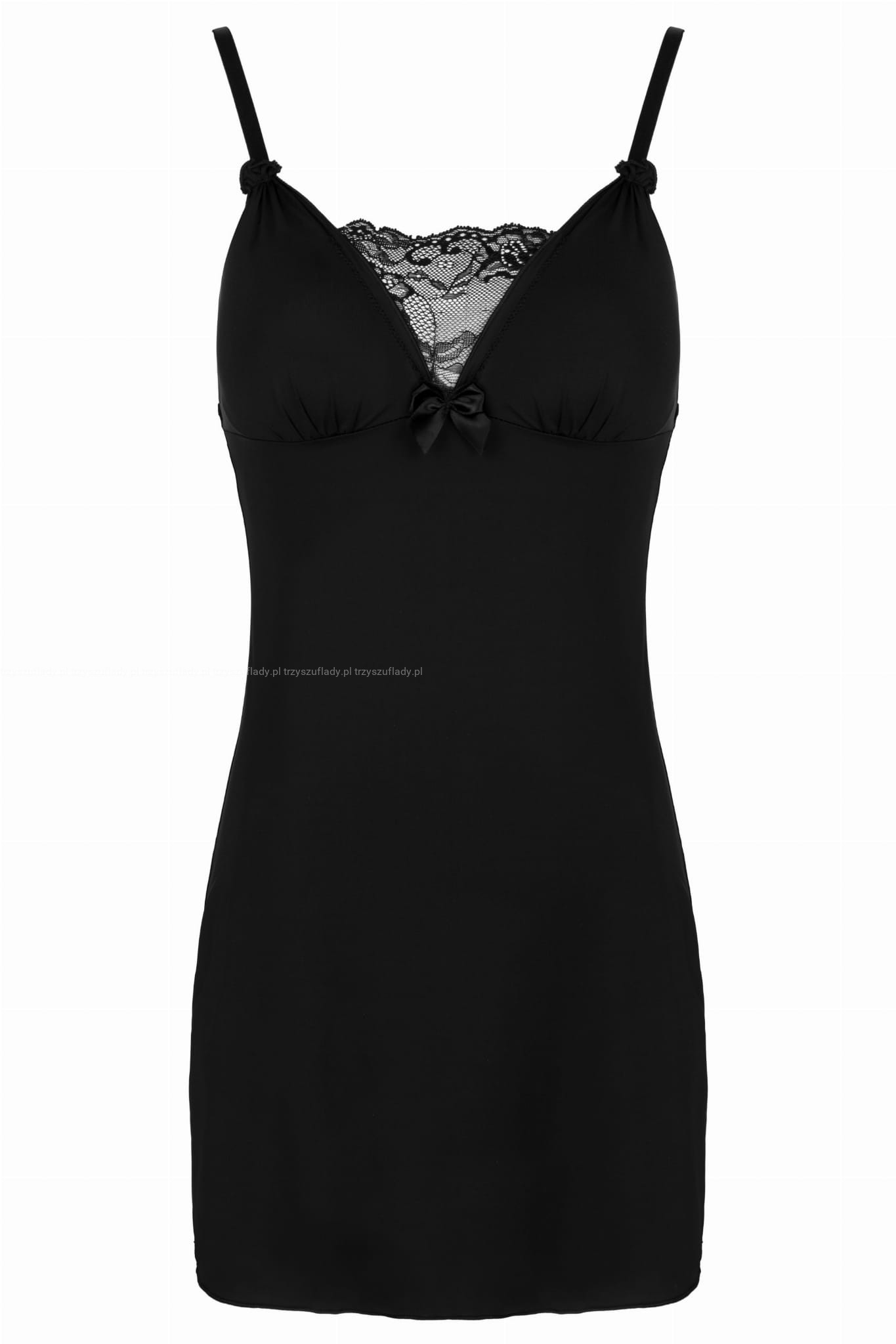 Nikaras Black to zmysłowa koszulka damska wykonana z delikatnego tiulu i pięknej koronki. Na cienkich, regulowanych ramiączkach, które krzyżują się na odkrytych plecach, dodając elegancji i seksapilu. Koszulka posiada głęboko wycięty dekolt ozdobiony misterną koronką. Dół koszulki również wykończony jest koronką, z uwodzicielskim rozcięciem na boku, ozdobionym małą, czerwoną kokardką. W komplecie znajdują się stringi.