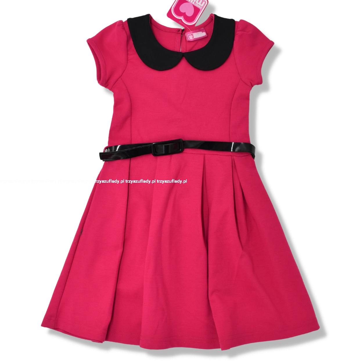 - sukienka różowa z kołnierzykiem w kontrastowym kolorze czarnym,
