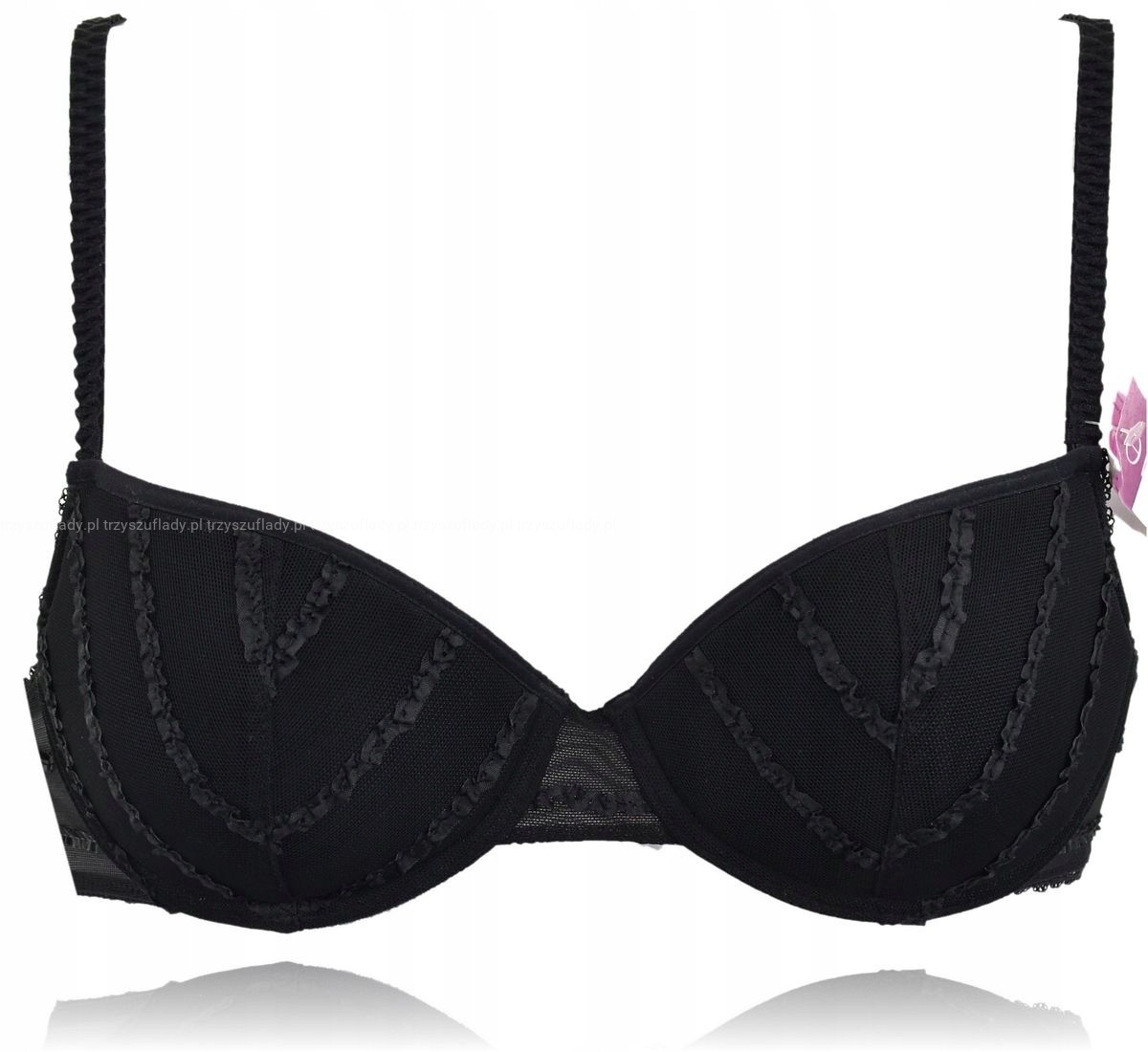 - miseczki stanika usztywniane, w otulinie z siateczki z dodatkową aplikacją ze skośnych marszczonych tasiemek