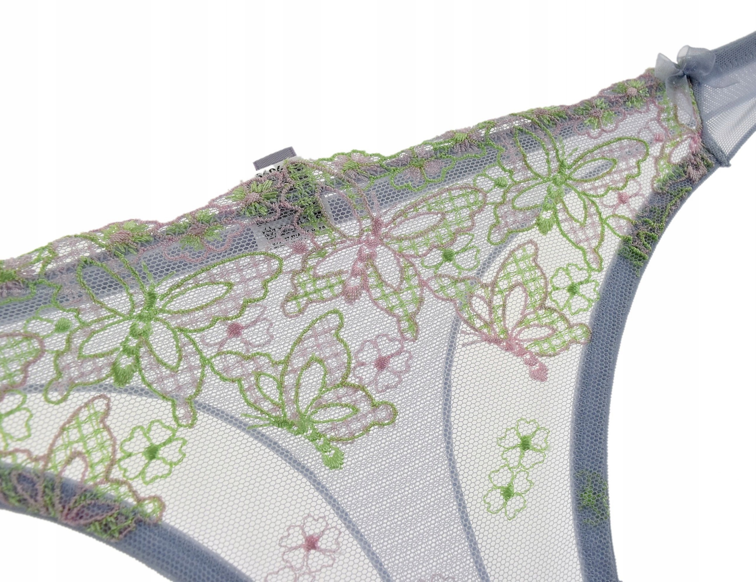 - stringi są ozdobione ślicznym haftem w motyle, wykonanym kontrastową zieloną nitką na niebieskim tle
