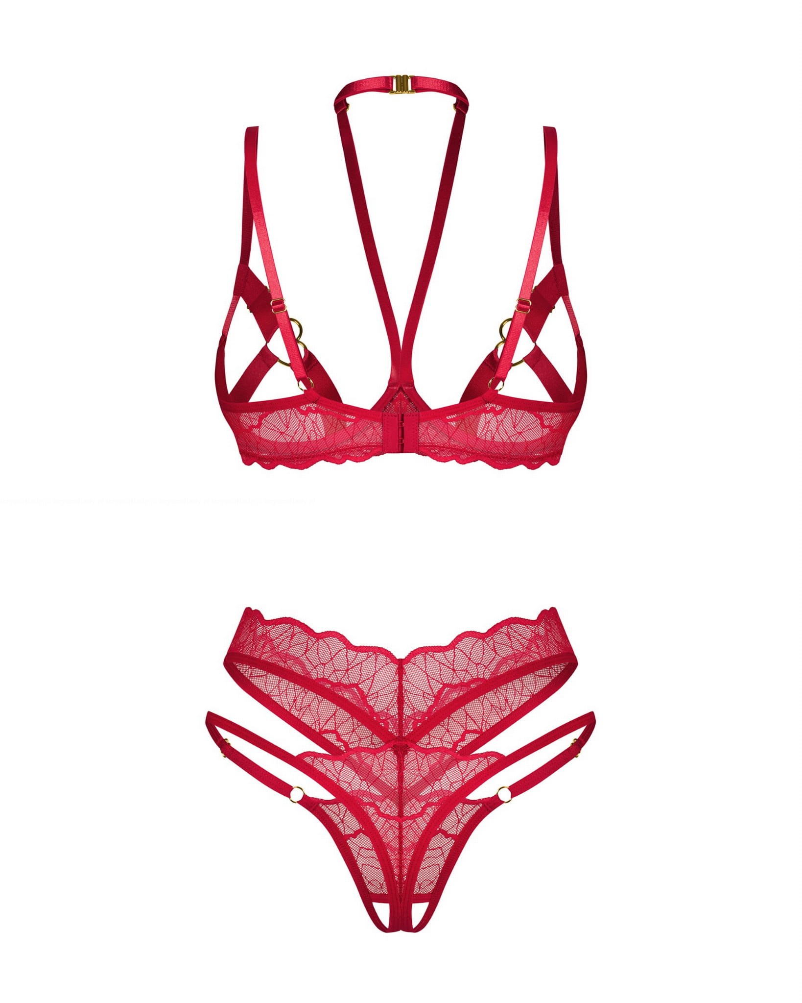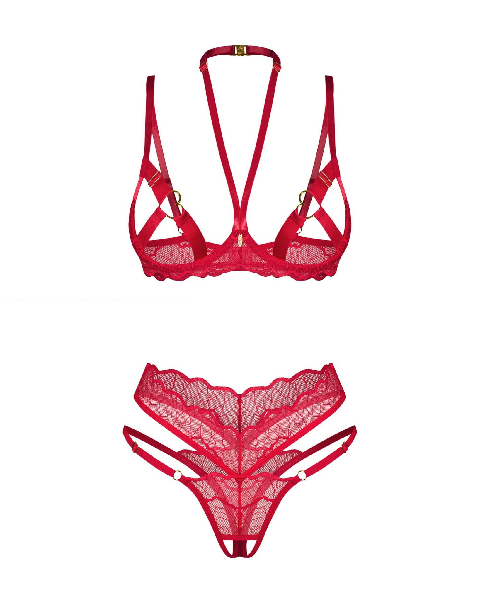 - Ramiączko na szyję – dodatkowy akcent, który wzmacnia zmysłowy charakter kompletu.