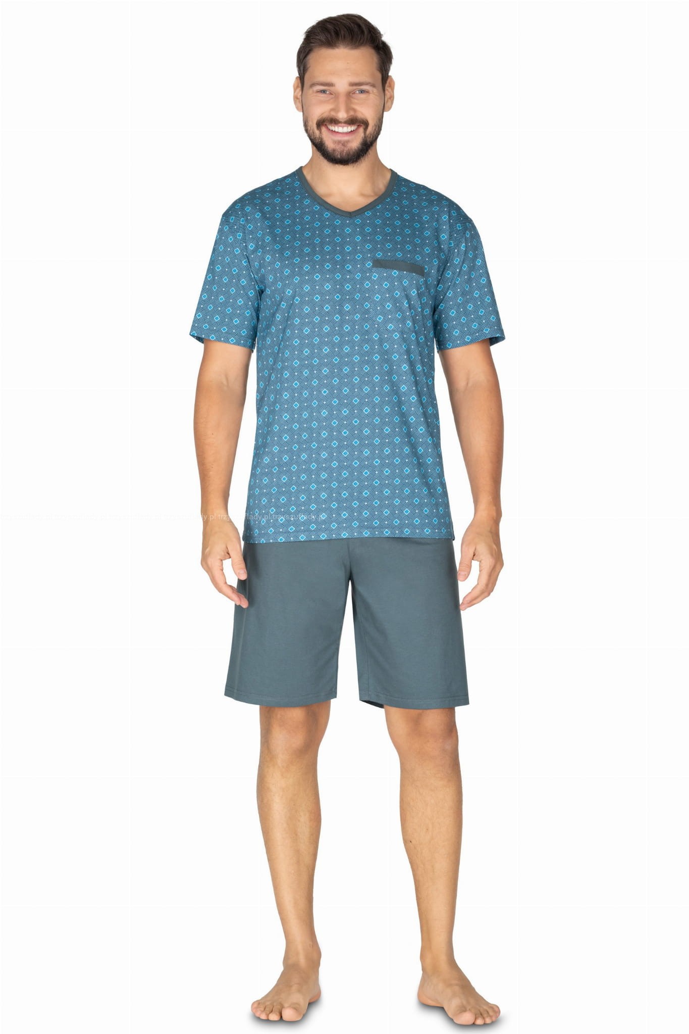 - Klasyczna letnia piżama męska wykonana z wzorzystej bawełny.
