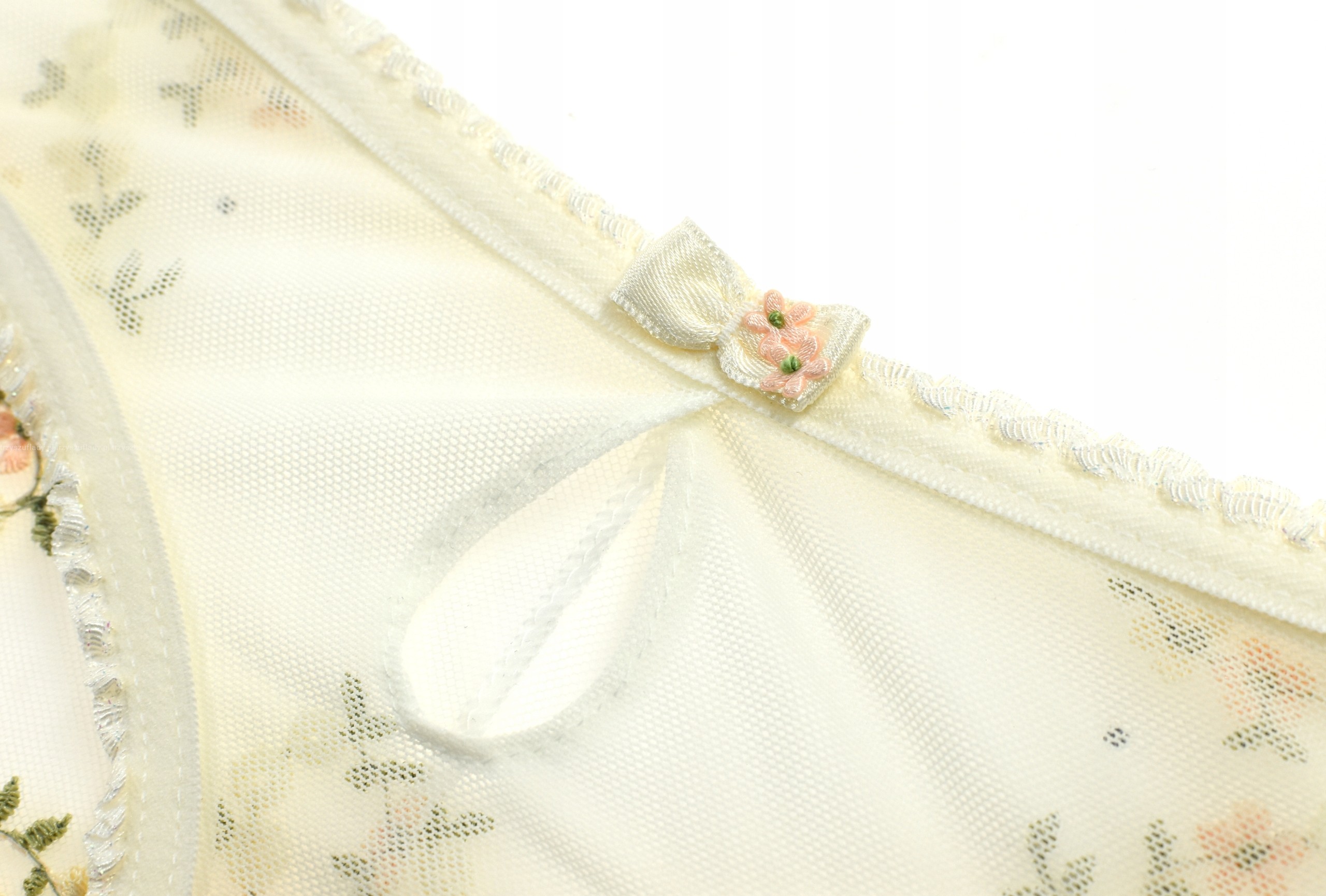 - w całości wykonany z elastycznej koronki - tiulu ozdobionego haftem w łączkę