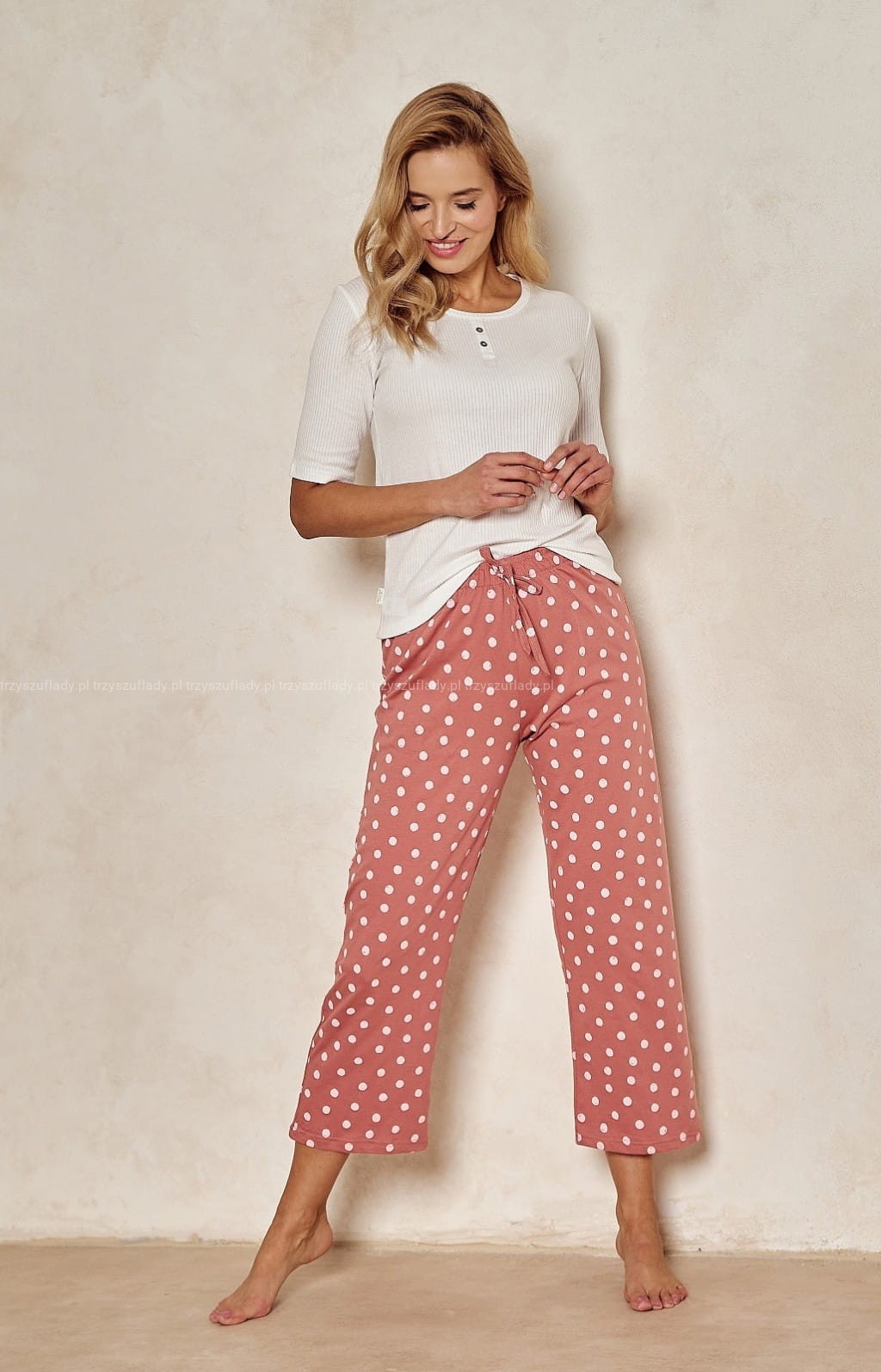 Luźne spodnie w kropki, z szerokimi nogawkami: Do kompletu dołączone są luźne spodnie w kropki, z szerokimi nogawkami o długości 7/8, które zapewniają swobodę ruchów i wygodę podczas snu.