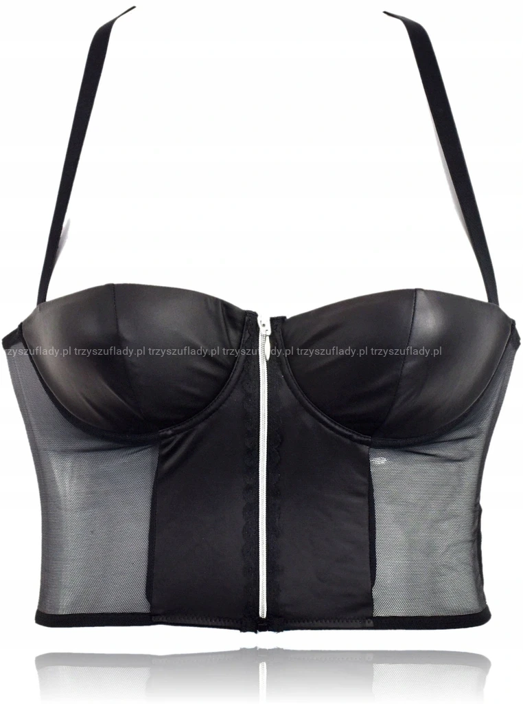 - bardzo niegrzeczny ;) mini gorset/stanik a' skóra [matowy] latex z zamkami, zapinany z przodu, wykończony na bokach transparentną siateczką i subtelną koronką przy zamku