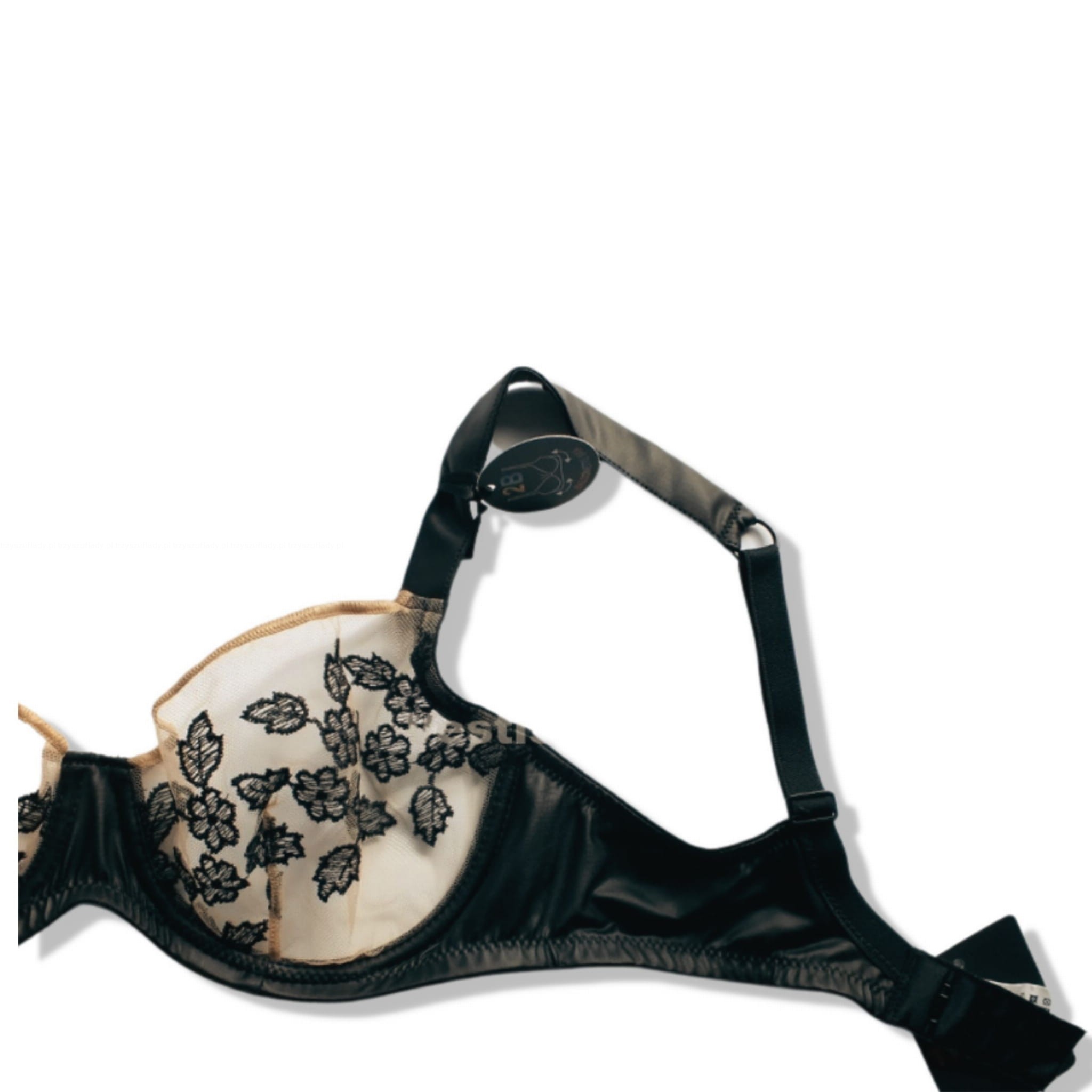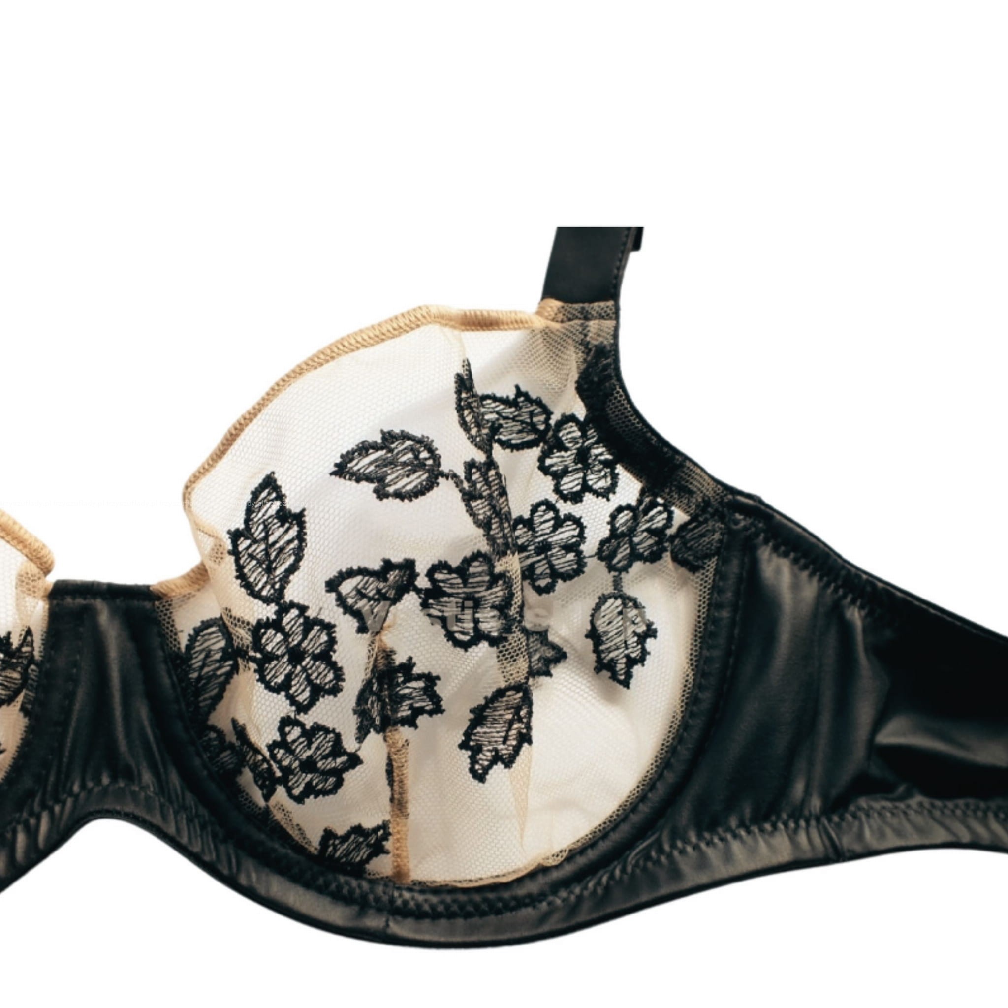 - miseczki stanika miękkie, wykonane z transparentnego beżowego tiulu haftowanego w czarne kwiaty, tkanina dość ścisła, dobrze "trzyma" biust
