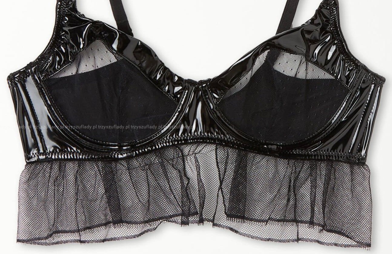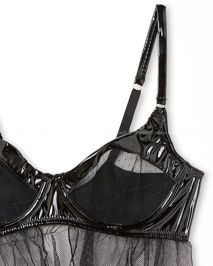 - wykonany z materiału z efektem powlekania ozdobionego romantycznymi przezroczystymi detalami - z tiulu, które nadają odważny, ale stylowy efekt.