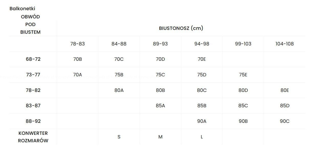 - W rozmiarach powyżej 85B liczba haftek i szerokość ramiączek może się różnić, aby zagwarantować większą wygodę i lepsze dopasowanie