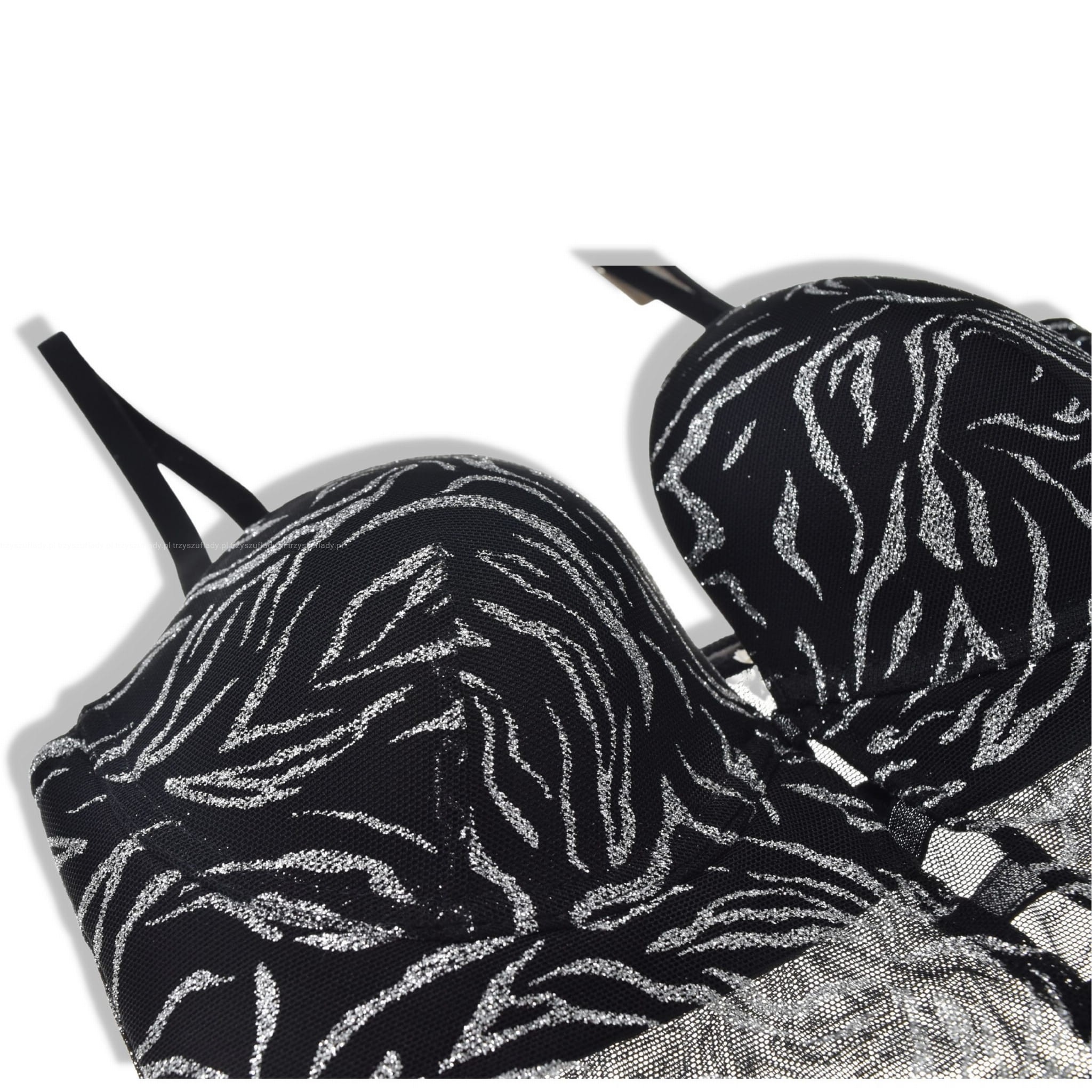 - miski na fiszbinach, o skośnym cięciu plunge, znakomicie sprawdzą się w kreacjach z głębszym wycięciem, dodatkowo dekolt podkreśli rozcięcie między miskami sięgające ko dołu pasa podtrzymującego, efektownie łączony 4 rzędami pasków,